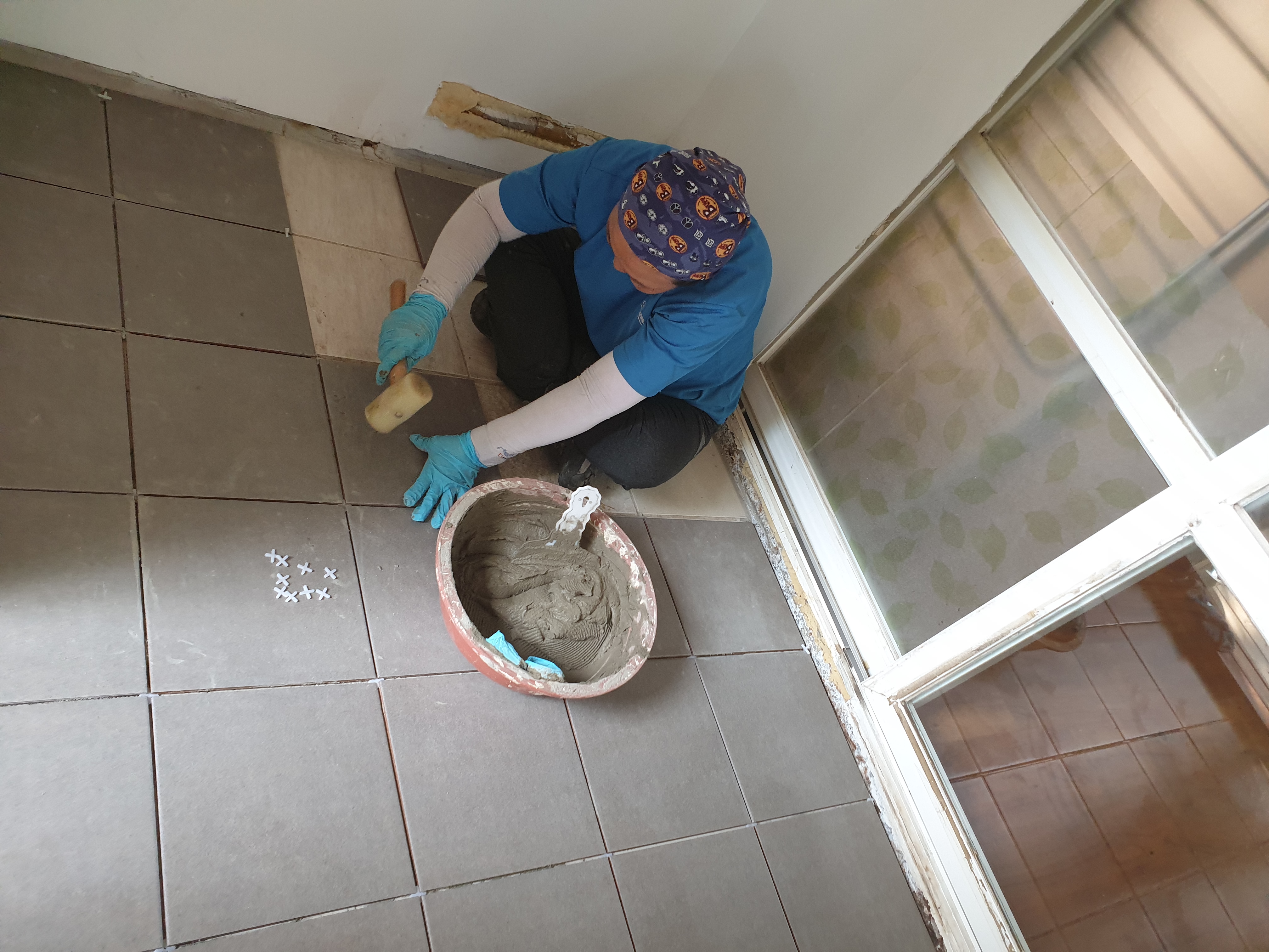 용언니가 철거해서 나온 나무들 정리하는 동안, 난 타일 붙이기 시작~